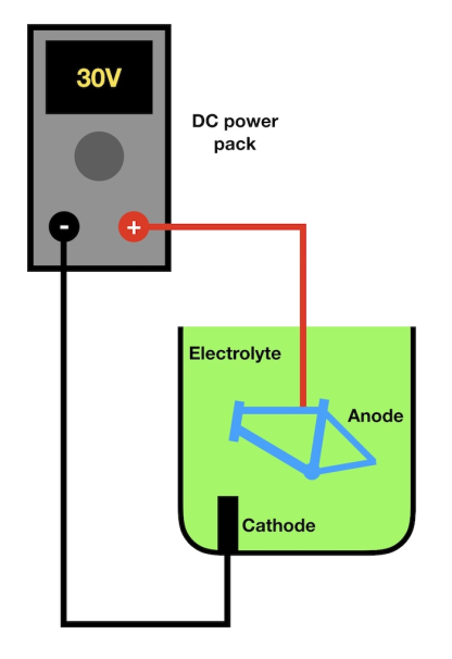 Para que el anodizado funcione, se requiere una fuente de alimentación de corriente continua (piensa en baterías, trenes de juguete, ¡NO en la energía eléctrica de la toma de corriente!), un baño electrolítico (agua destilada con sal de epsom) y que todo el proceso esté libre de metales ferrosos (metales basados en hierro, por ejemplo, acero). Aquellos que recuerden la física en la escuela recordarán que para que un circuito eléctrico funcione, el circuito debe estar cerrado y completo. Nuestro circuito se completa cuando la joyería está conectada al Ánodo (positivo, cable rojo) y sumergida en el baño electrolítico. El diagrama anterior muestra esto: