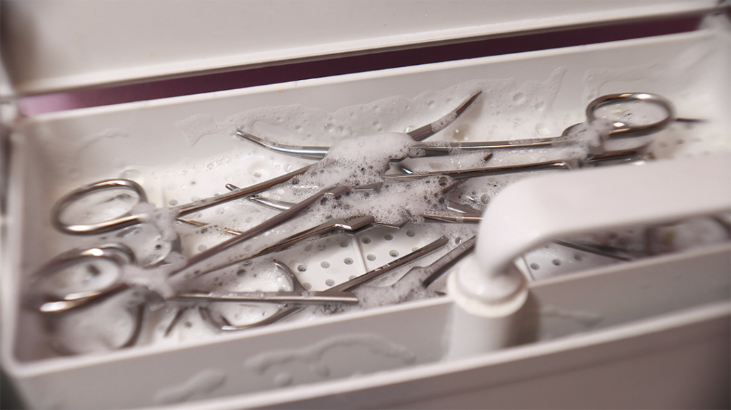 • Inmediatamente después del uso: Coloca los instrumentos utilizados en una bandeja con detergente enzimático. Este tipo de detergente es efectivo para descomponer biopelículas, proteínas, grasas y otros materiales orgánicos.